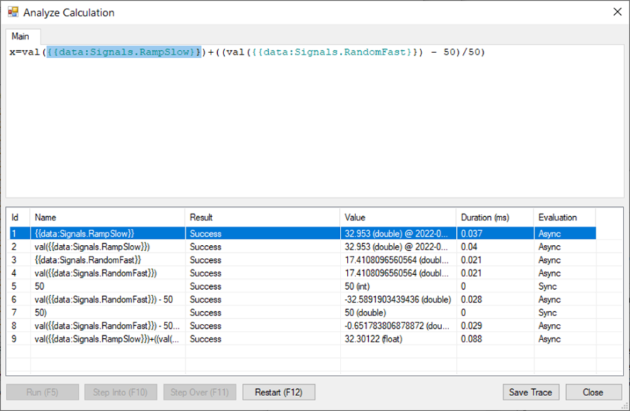 When the “Analyze Calculation Dialog” is shown, click on the “Run” button to show the complete evaluation stack. If a step-by-step evaluation is preferred, then the “Step Into” or “Step Over” buttons can be used. If a performance calculation uses custom calculation functions, the used functions appear as additional tabs in this dialog. Selecting any line in the list of evaluation steps also highlights the related part of the expression text in the upper part of this dialog.