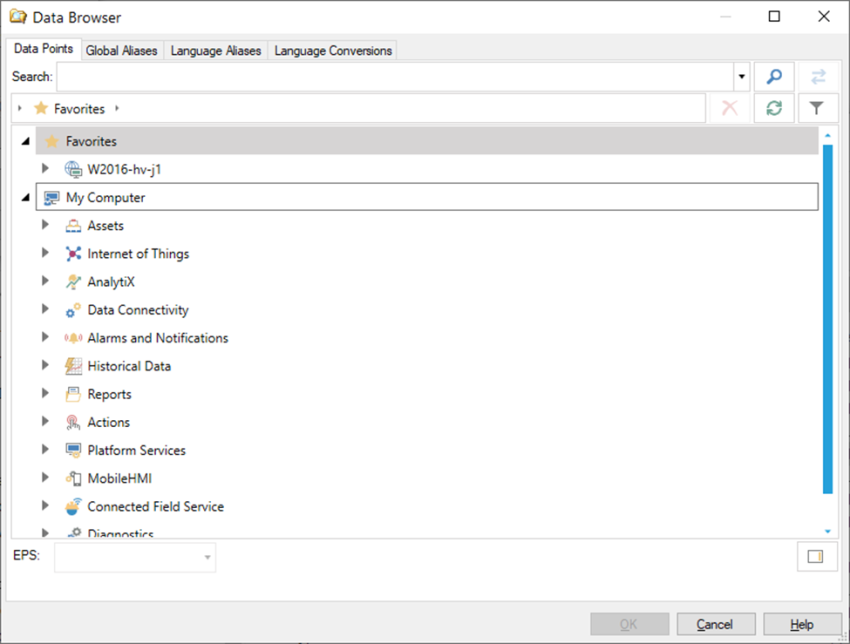 As a first thing, the point name to read historical values from, must be specified. The syntax of a data point must follow FrameWorX syntax. To simplify the process of selecting a data point name, standard ICONICS’s Data Browser can be used (opened by clicking on button with three dots).