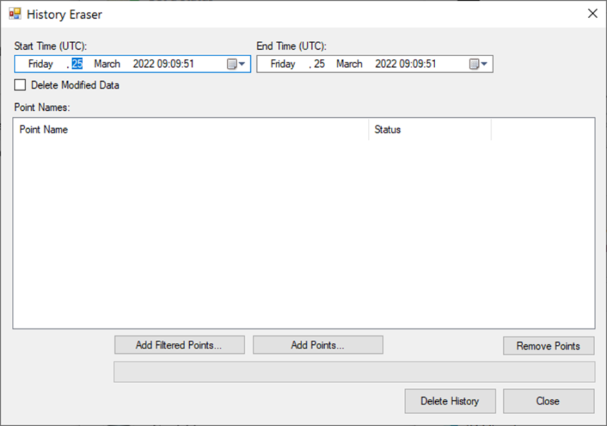Use the “Add Point” button to invoke the standard data browser and select (a) data point(s) to delete history. In this mode, the browser allows a multi-selection of data points to insert.