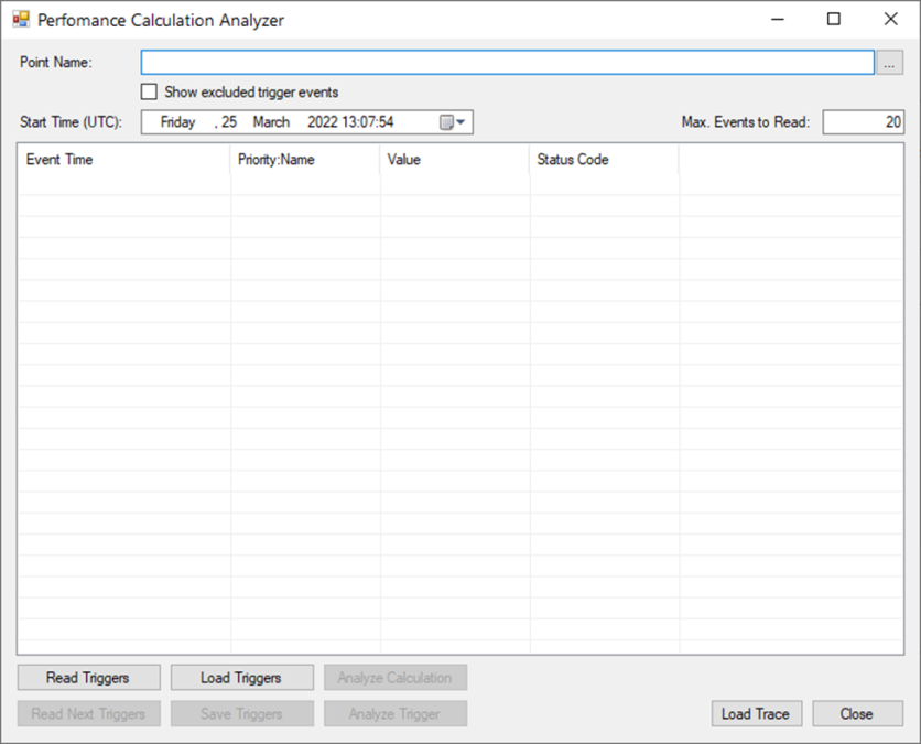 Once the data point name is specified, the first logical step is to get calculation triggers – i.e., events when calculations are supposed to run. All available trigger events will appear in the list view in the middle of ”Calculation Analysis” dialog. First specify a start time (in UTC) to search for the closest trigger event. Then # of returned trigger events can be limited by “Max. Events to Read” value. By default, it reads 20 trigger events. Once these parameters are specified, click on the “Read Triggers” button to perform the first trigger events read. After the first N triggers is read, the “Read Next Triggers” button should be enabled and allows to read next N trigger events. These trigger events can be persistently stored in a file by clicking on the “Save Triggers” button. Such files can be loaded back later for further investigation by clicking on the “Load Triggers” button.