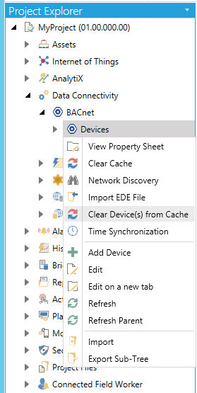 Expand theBACnetnode. Select the Devices node, then click on Clear Device(s) from Cache in the pulldown menu in the Project Explorer, as shown below.