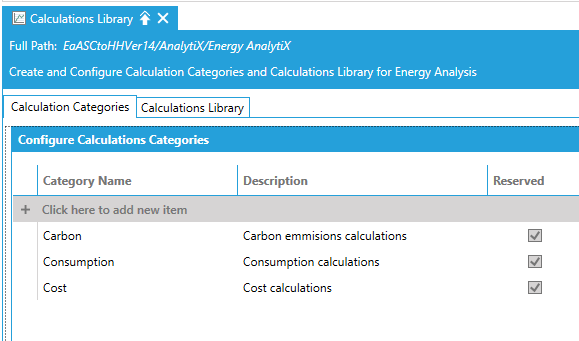 Calculation categories are used to categorize energy calculations data in groups, so that the runtime charts and reports can produce meaningful visualization and reporting results. They are also used in runtime filtering operations.
