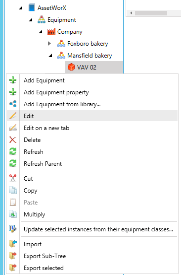 Double-click on your selected Asset in the AssetWorX Project Explorer to edit its properties, or right-click the selected Asset then click on Edit, as shown below.