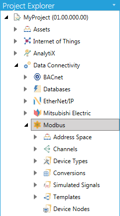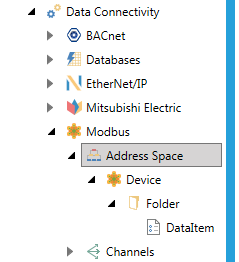 The Modbus configuration offers several levels in its hierarchy. The Modbus module uses the terms Folder and Data Item.