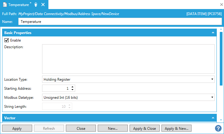 Give the data item a name and set its properties such as Modbus Datatype and Device Address then click on Apply. Your Modbus data item is now ready to be used in OPC client applications like GraphWorX64.