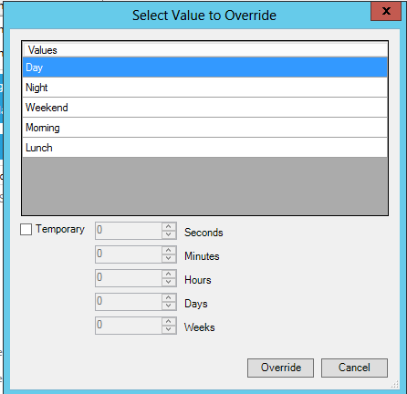 - Override - Click on theOverridebutton to open the Select Value to Override dialog box. Set the Override Value. This value corresponds to one of your Valueset values. If the override is temporary, click the 'Temporary' checkbox, then schedule a length of time that the override will take place (in Seconds/Minutes/Hours/Days). Click OK to accept the override. You will then notice that the Current Status information in the Runtime tab of the Schedule updates accordingly.
