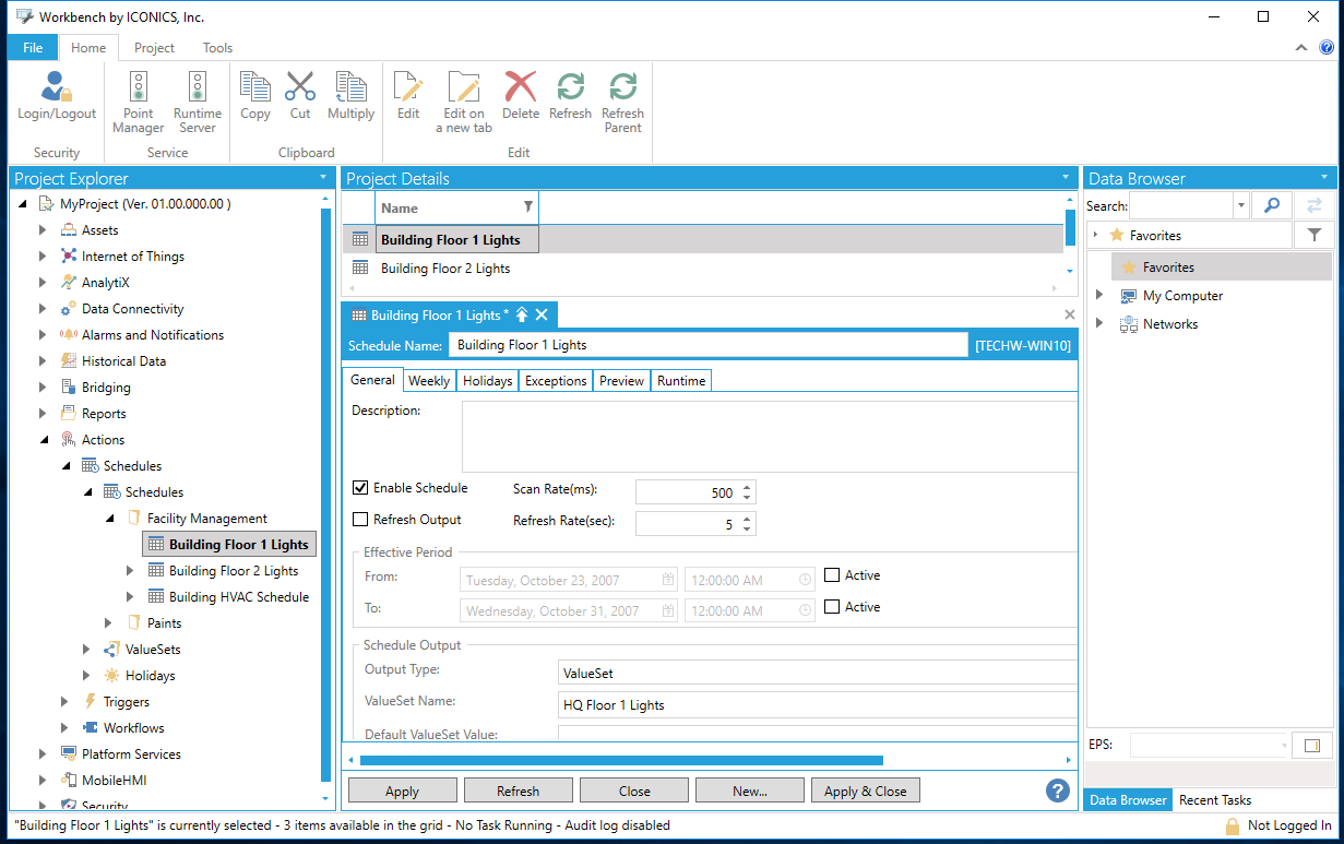 - Click on a Schedule in the Project Explorer. (Associated schedules can be found in the right-side window of the Workbench once a containing folder is clicked.)