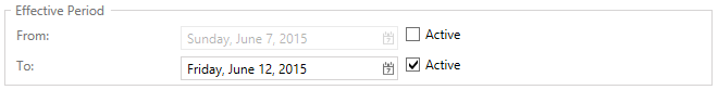 - Click the checkbox next to Active for the From date. Select the pulldown box to set a date. Once the checkbox has been selected, click the From pulldown box and select a date or use the up and down arrows to do so.