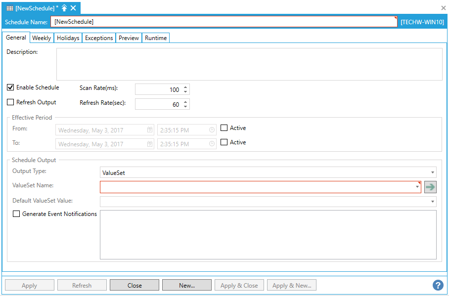 When both Active checkboxes are disabled, the From: and To: dates are ignored and the schedule runs whenever ScheduleWorX64 is in runtime.