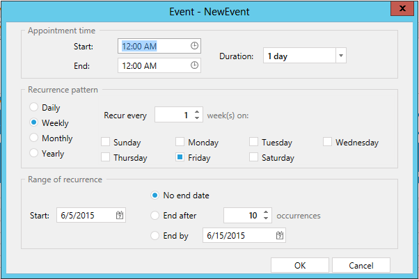 Appointment Time. The Start, End, and Duration are pre-filled with the times from the original event that you selected for the recurrence.