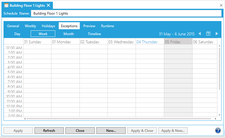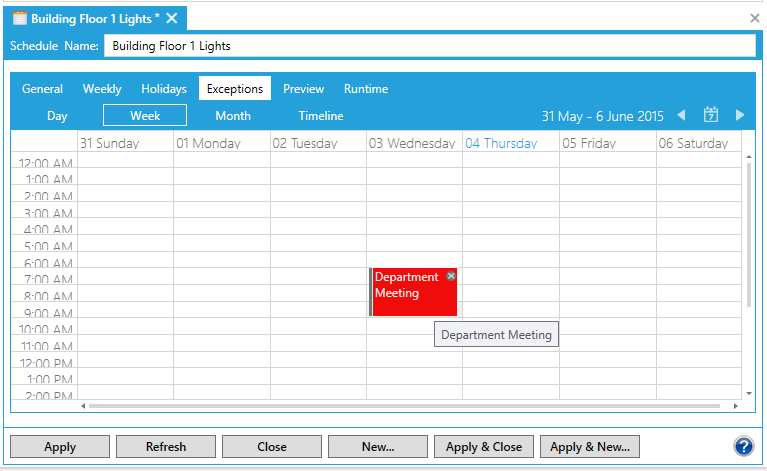 The Exceptions tab can display a daily, weekly, monthly or timeline view calendar. The primary use of the Exceptions tab is to create events that take precedence over previously defined scheduled events and to create recurring events that have periods other than weekly. When an exception takes place at the same time as a scheduled weekly or holiday event, the exception takes precedence. Only an override takes precedence over an exception.