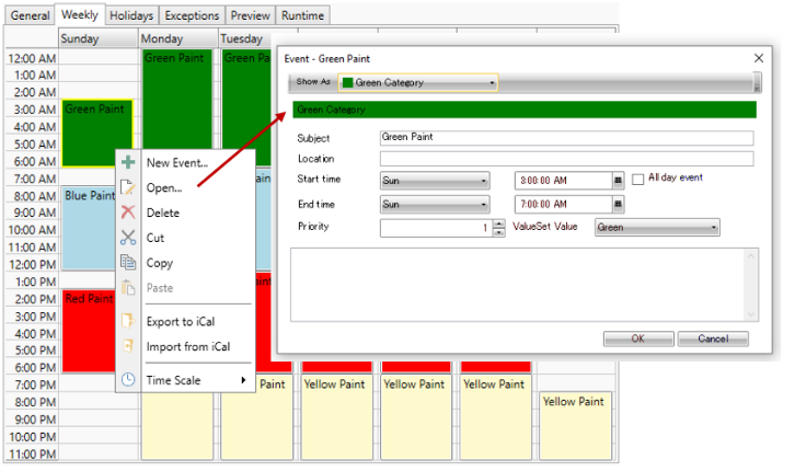 Event priority can also be used to set different importance to events. For example: if on Sunday at 3 – 7AM there are two weekly events, the one with higher priority will take precedence over the lower priority.