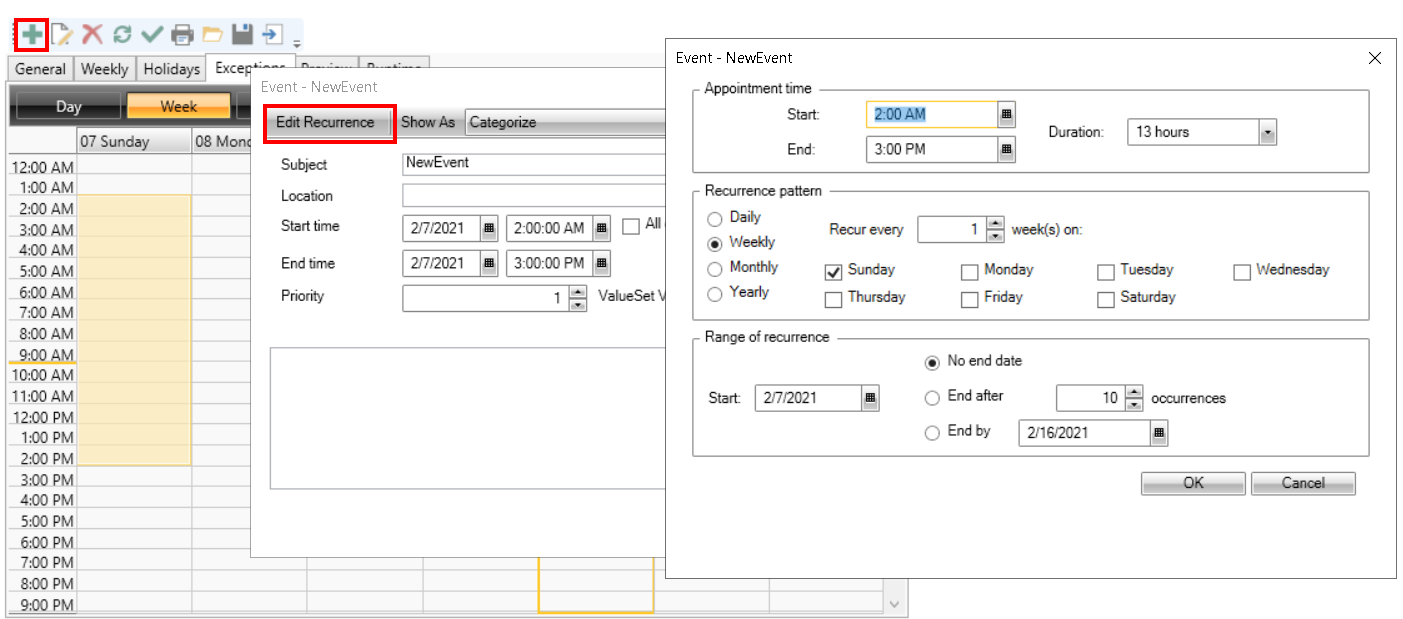 Exception events work similar to events inserted in the Weekly tab, but exceptions have a higher priority. Exception events will always occur instead of a weekly event if they share a time slot. Unlike events inserted in the Weekly tab, Exceptions do not repeat weekly by default.