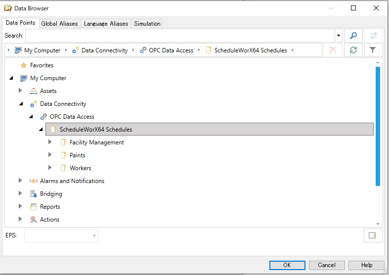 The Source Tab allows you to connect to a Schedule Data Source. Click on the … button next to Data Source and it will show a Data Browser. Select a schedule to show in the Schedule Control. Browse to My Computer > Data Connectivity > OPC Data Access > ScheduleWorX64 Schedules > … for sample schedules.