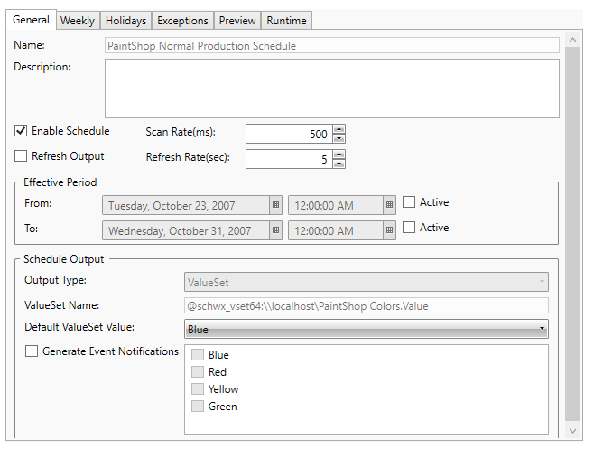 After configuring basic properties of Schedule Control, you can go into runtime. Once in runtime, it will allow you to View and update the selected schedule on the GraphWorX64 display.