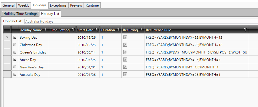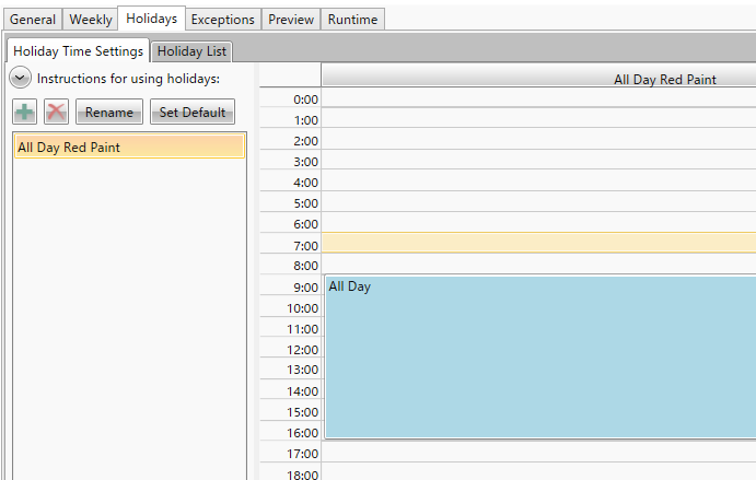 On a Holiday list you will be able to view current Holidays associated with each Schedule. You can associate Holidays to a holiday list for ScheduleWorX64 inside Workbench. You must associate Holidays to a Holiday List before you can apply it to any Schedules.