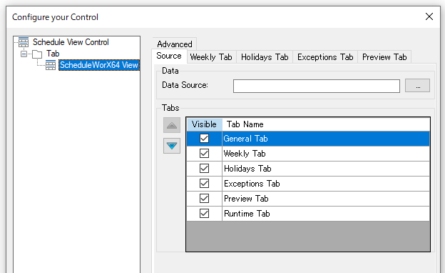 Click ScheduleWorX64 View to show its properties on the right side. By default, the Schedule Control will show six tabs during Runtime. You can toggle these by checking items under the Visible column.