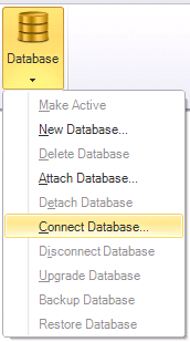 Database button in the Edit section of the Home ribbon at the top of Workbench64 and select Connect Database. Other menu options using this method include Make Active, New Database, Delete Database, Attach Database, Detach Database, Disconnect Database, Upgrade Database, Backup Database and Restore Database.