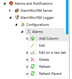Right-click a Configuration in the AlarmWorX64 Logger tree control and select Add Column, as shown below.