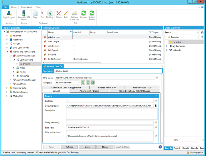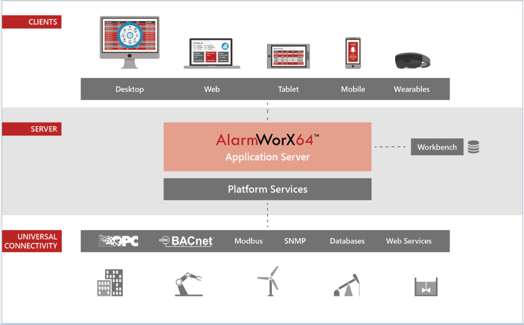 AlarmWorX64 Server is an ICONICS server application that communicates with OPC UA, OPC-AE, and OPC-HDA real-time and historical data sources. The AlarmWorX64 Server receives field data from any OPC-compliant Data Access server and performs alarm detection and reporting based on the OPC Alarm and Events Standard.