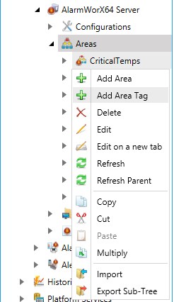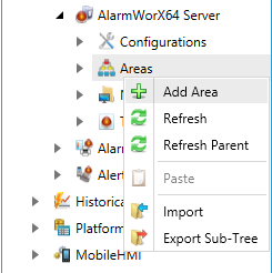 Tip: If you are creating a new configuration, you can copy an existing configuration's Area folder by exporting it from that configuration, then import it into the new configuration. You can also copy individual areas from one configuration to another. For instructions, refer to Exporting and Importing AlarmWorX64 Server Components. |