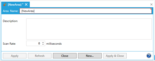 Enter the Area Name and Description, then click the Apply button. Next, enter a Scan Rate for the Area in milliseconds.