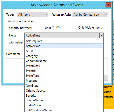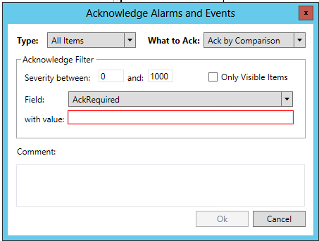When you are acknowledging alarms, you can use filters to choose a broad or limited range of alarms which you can acknowledge all at once. You can create a condition or comparison that is used to select the alarms to be acknowledged. Should you select "Ack by Comparison" in the What to Ack pulldown, you can specify the range of severity of the alarms you are acknowledging within the Severity Filter section. Enter the severity range (between 0 and 1000) in the "Severity between:" number entry fields. You can also decide to acknowledge "Only Visible objects" by clicking on the checkbox.
