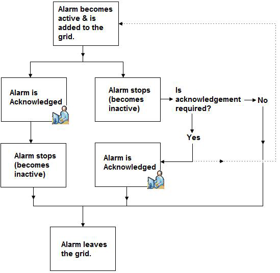 The figure below shows the general acknowledgement process. The process may vary, depending on the alarms and their conditions and acknowledgement requirements. For example, if an alarm requires acknowledgement when it returns to normal, then the alarm is considered to be active until it is acknowledged; acknowledging inactivates it. When an alarm becomes inactive (that is, the conditions that triggered it no longer exist), then the alarm leaves the grid unless a required acknowledgement has not yet been given.