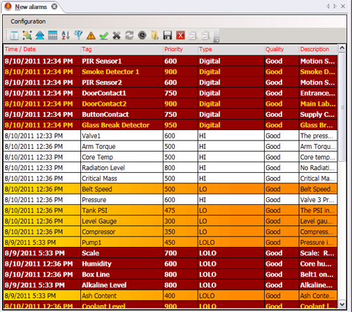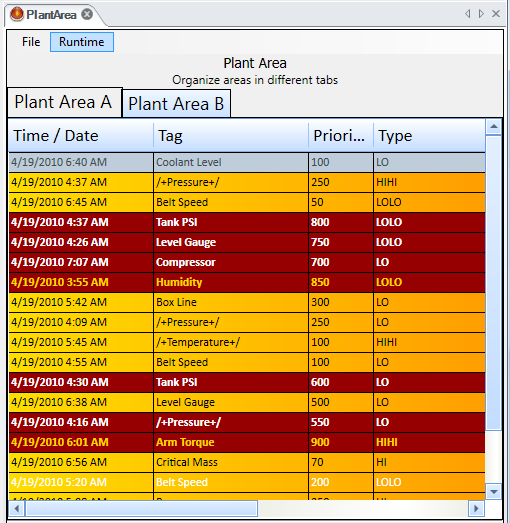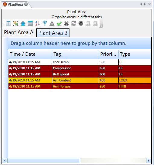 Notice the bar that has the caption Drag a column header here to group by that column. This feature allows you to graphically group your display; you can do so in both configuration and runtime modes. The figure below shows a two-level grouping, where alarms are grouped by Priority, and then by Tag. Conceptually this works identically to a sort operation. To reorder a group you would drag and drop the column header onto the bar in the order that you prefer. To remove a grouping simply drag it off the bar until you see an X icon. Changes you make are immediately displayed.