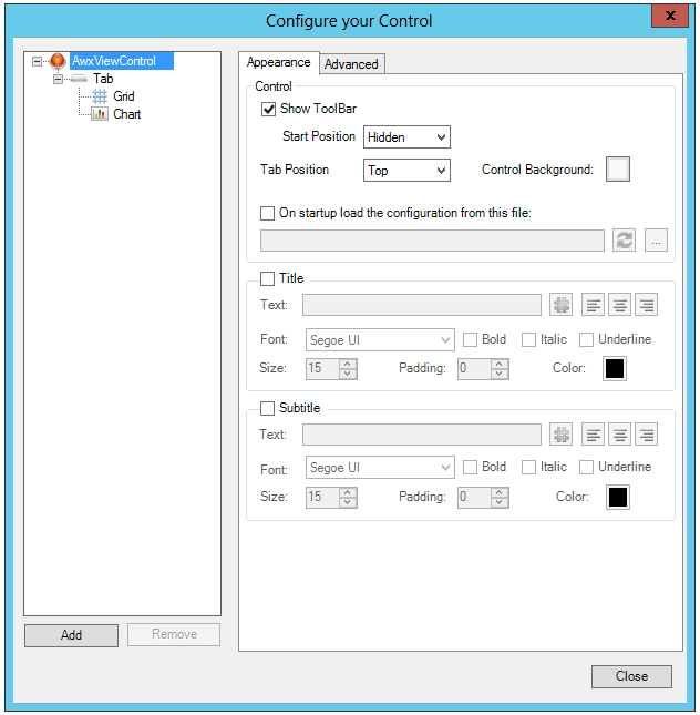 Although all objects have an Appearance tab, not all options are contained on each one. For example, the Show Outline option draws a box around the viewer; that option would not be useful for a grid object as it defeats the purpose of grid lines. The significant features exposed on this tab are the ability to change the name of the viewer and control its display, as well as to add a subtitle as a second line below the title. You can also dock the toolbar top, bottom, right, and left, as well as float the toolbar; but these operations are available using your mouse in runtime as well. The table below summarizes the options available to a control in AlarmWorX64 Viewer .