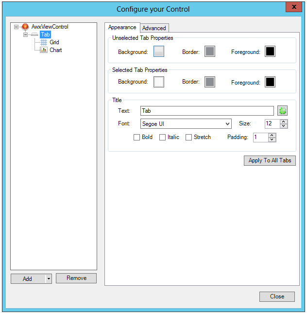 Unselected Tab Properties: These properties allow you to set the color of the background and border as well as the amount of padding separating the tab from the header and grid objects for any tab that isn't currently in view.