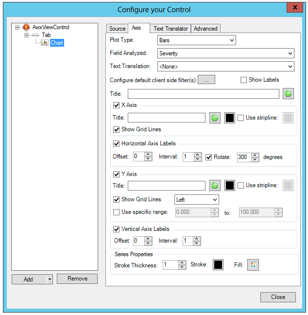 Axes tab: Provides options for titles, grid lines, and labels. For details, refer to Axes Tab, below.