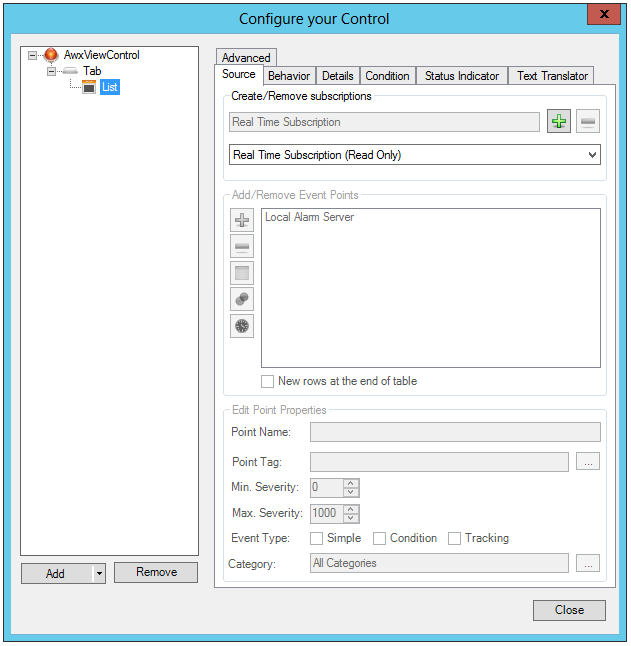 Source tab: Sources are described in Working with Alarms under the heading To configure an alarm source (an alarm subscription).
