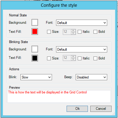 Notice that you not only have control over text qualities and color, but you can also have alarms blink or set the properties so that your alarm beeps at various speeds (Slow, Normal or Fast) to signal the operator that an alarm condition exists. Look at the example above. Note that, for this alarm, the Normal State of "Acked" displays a white background with a red foreground (that is, red text).