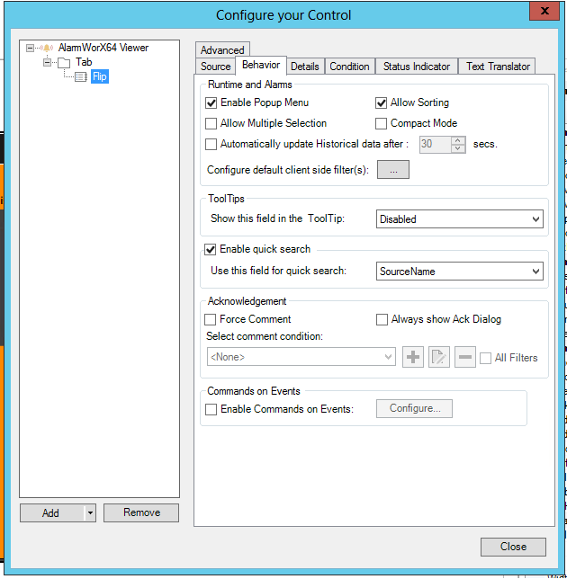 Note: The AlarmWorX64 Viewer is one of many controls that now supports executing commands on events. These events vary per control, but for the AlarmWorX64 Viewer they include: