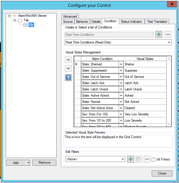 A condition is made up of a filter and a visual style. In runtime, if the filter is true for a row, then the related visual style is applied to the row. You can create as many conditions as you have filters and visual styles. When creating a new condition, you specify the values, the condition level's name, and how each condition appears in the grid's alarms at runtime.