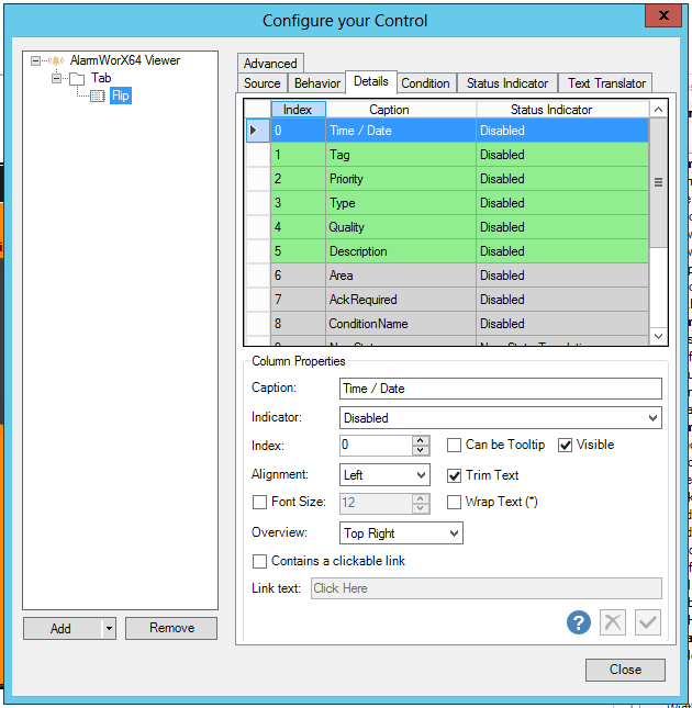 Text Translator tab: Define text for each alarm condition. Refer to Text Translator Tab Options in AlarmWorX.