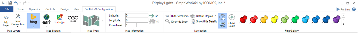 The EarthWorX Configuration ribbon is available in GraphWorX64 after you have added an EarthWorX map to the display. The ribbon appears when the EarthWorX Viewer object is selected in the Project Explorer. Use the ribbon to configure and manipulate the EarthWorX map that you are creating. You can learn more about this ribbon in the topic EarthWorX Configuration Ribbon.
