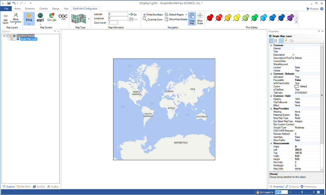 The figure below shows the initial display of an EarthWorX map in GraphWorX64. The Project Explorer on the left shows the selected EarthWorX Viewer object; SmartPins and PushPins are also listed here as well as other GraphWorX64 objects. Since you can only add one EarthWorX map to a display, only one is ever listed in the Project Explorer. Note the EarthWorX Configuration ribbon above the map, and the EarthWorX Viewer properties at the right. These features are described below.