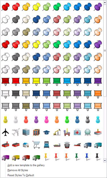 Reset Styles to Default - Returns all PushPins in the gallery to their initial, installed settings. If any settings have been changed, this option removes those changes.