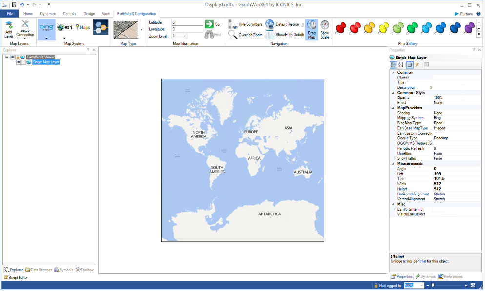 Start the map interaction by zooming in on it as you would do in a regular GraphWorX64 display. The map will load additional details as needed while zooming and panning over it. Alternatively, you can also use the commands provided in the EarthWorX Configuration ribbon to perform other operations, including changing the map type, jumping to a specific location, import additional data, adding pushpins and much more. To change the map type, click on the “Map Type” button in the “EarthWorX Configuration” ribbon, and select your preferred map type.