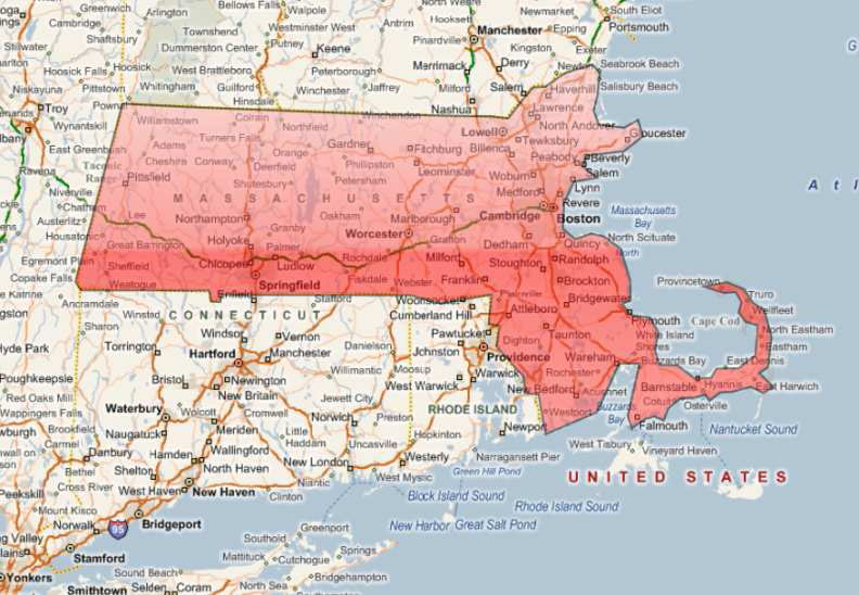 The mouse cursor will change to indicate the polygon drawing mode. Now, click on the points of the map that represent the border of the desired region. In this example, the border of the state of Massachusetts has been drawn.