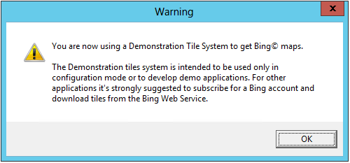 The above warning message informs you that you are now using the demo version of Bing Maps. Microsoft allows you to use the maps with some limitations. However, for real applications, you should obtain a valid license from Microsoft. For the purpose of this example, you can continue using the demo tiles to evaluate the functionality of the EarthWorX control. After you click “OK”, the display will contain the EarthWorX map and you are ready to start working with it.