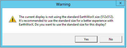 Once the control has been added to the display, a warning message pops up to inform you that the display is not using the default EarthWorX size and will provide the choice to automatically resize the display. The reason for this choice is due to the EarthWorX world map having a default size of 512x512 pixels at its minimum zoom level. If your display is bigger than that, then you might end up having white areas around the map. However, it should be noted that if the final map will be zoomed in to a particular region or country, you can use another display size without any white space around your selected map.