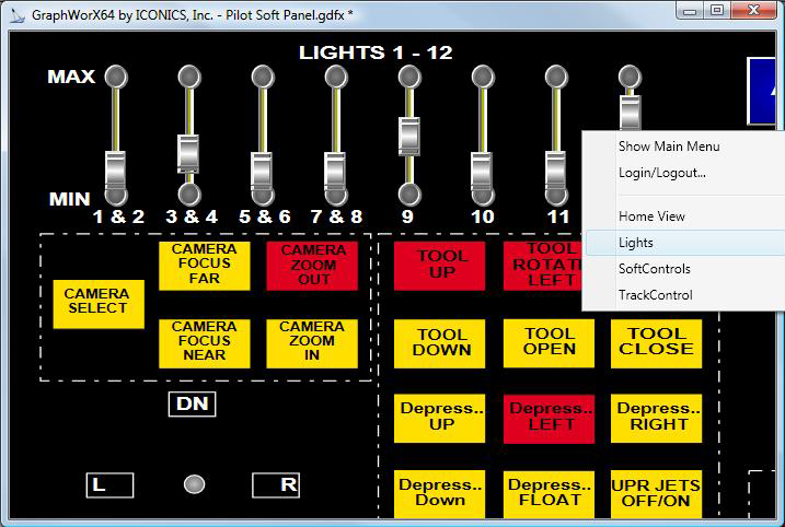 Some 2D GraphWorX displays may be quite large. To help runtime users navigate large or complex displays, you can create views that automatically zoom and scroll to areas of detail that runtime users need access to. A view is a snapshot of a portion or subsection of a display. The same pre-set views that you create for runtime users will be available to you during configuration. During runtime, users can right-click the display to see a list of views; in configuration mode, you can see a display's views by right-clicking the display and selecting Custom Views. Clicking on a view takes you to that view.