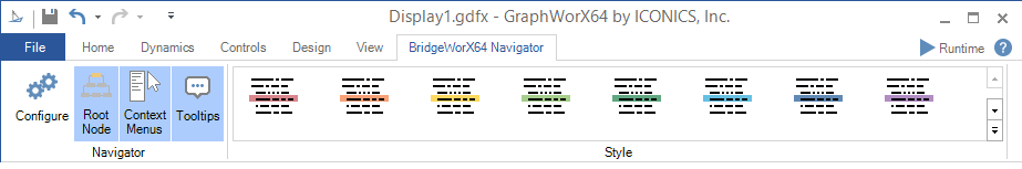 Putting a GraphWorX64 display containing a BridgeWorX64 Navigator control into Runtime mode allows for additional options, as shown below.