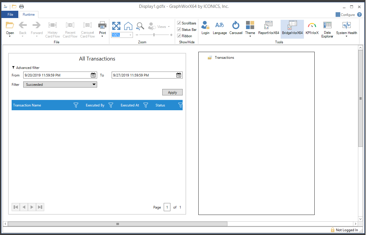 The BridgeWorX64 Navigator control in GraphWorX64 provides the ability to see a populated tree control of bridging transactions in Runtime mode in a GraphWorX64 display.