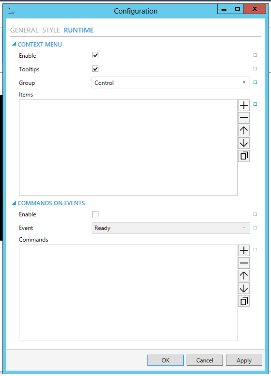 Commands - List of commands to perform when selected control event occurs. Click on the plus sign [+] to add an item to the list. Click on the minus sign [-] to remove a listed item. Click on the up arrow to move a selected item higher in the list. Click on the down arrow to move a selected item lower in the list. Click on the