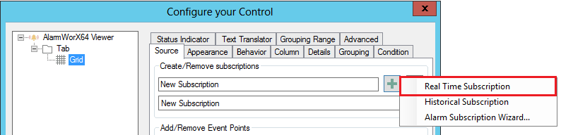 Double-click the AlarmWorX64 Viewer to bring up the Configure your Control popup menu.