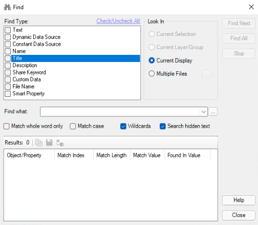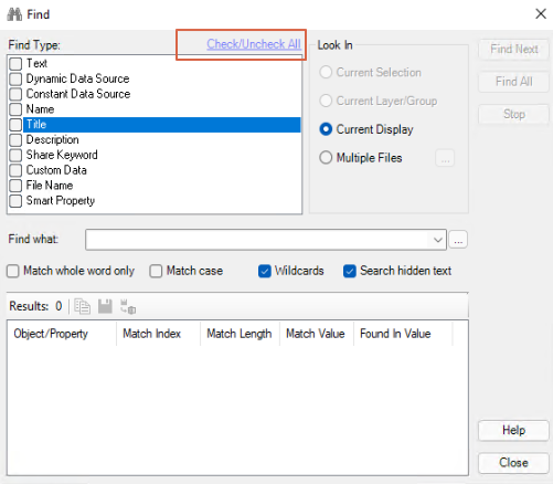 In the Find Type box, specify the properties in which you want to replace the text string. Putting a check mark beside an option indicates you want to replace the text string in the property:
